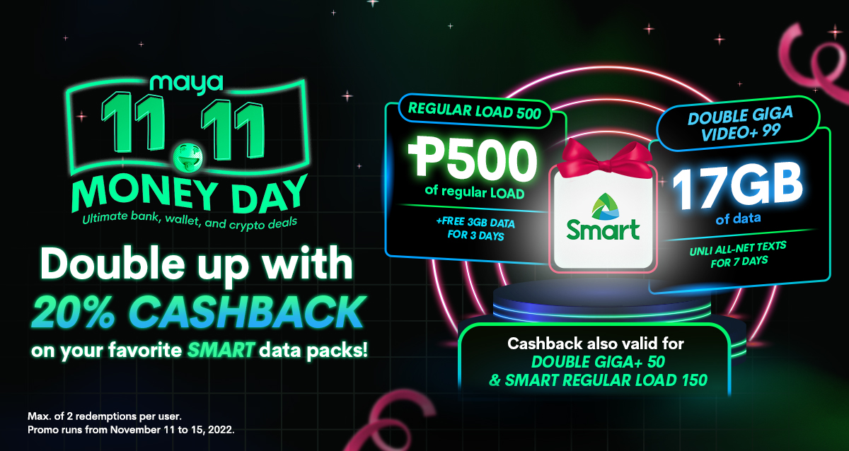 2. This promo is open to all existing Maya users with Smart or TNT mobile numbers only who will transact during November 11-15, 2022, valid for self-load and gifting.