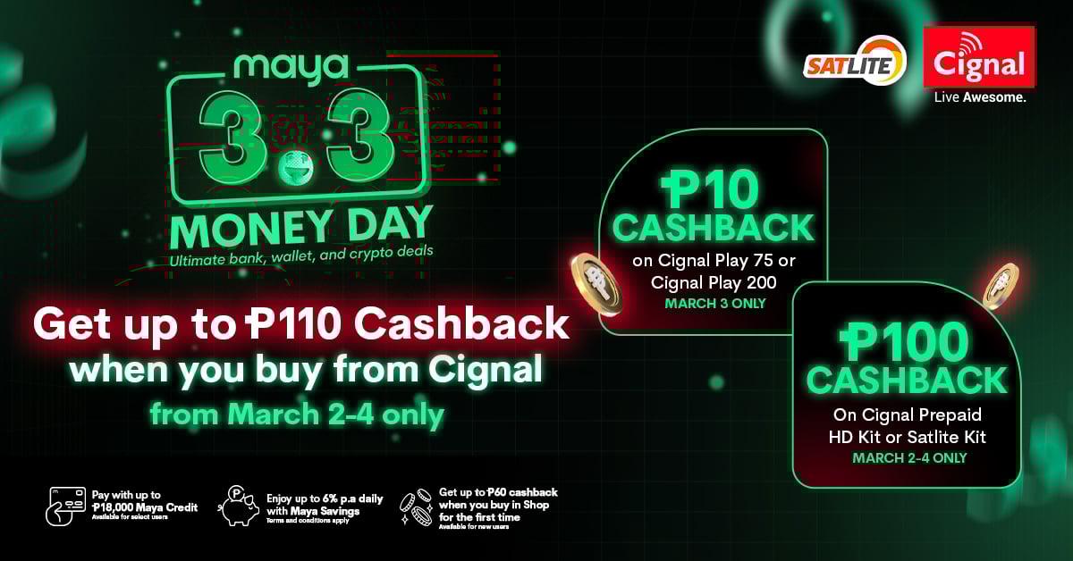 Get 5% cashback voucher when you buy Cignal Prepaid Kit or Satlite Prepaid Kit from March 2-4 only.